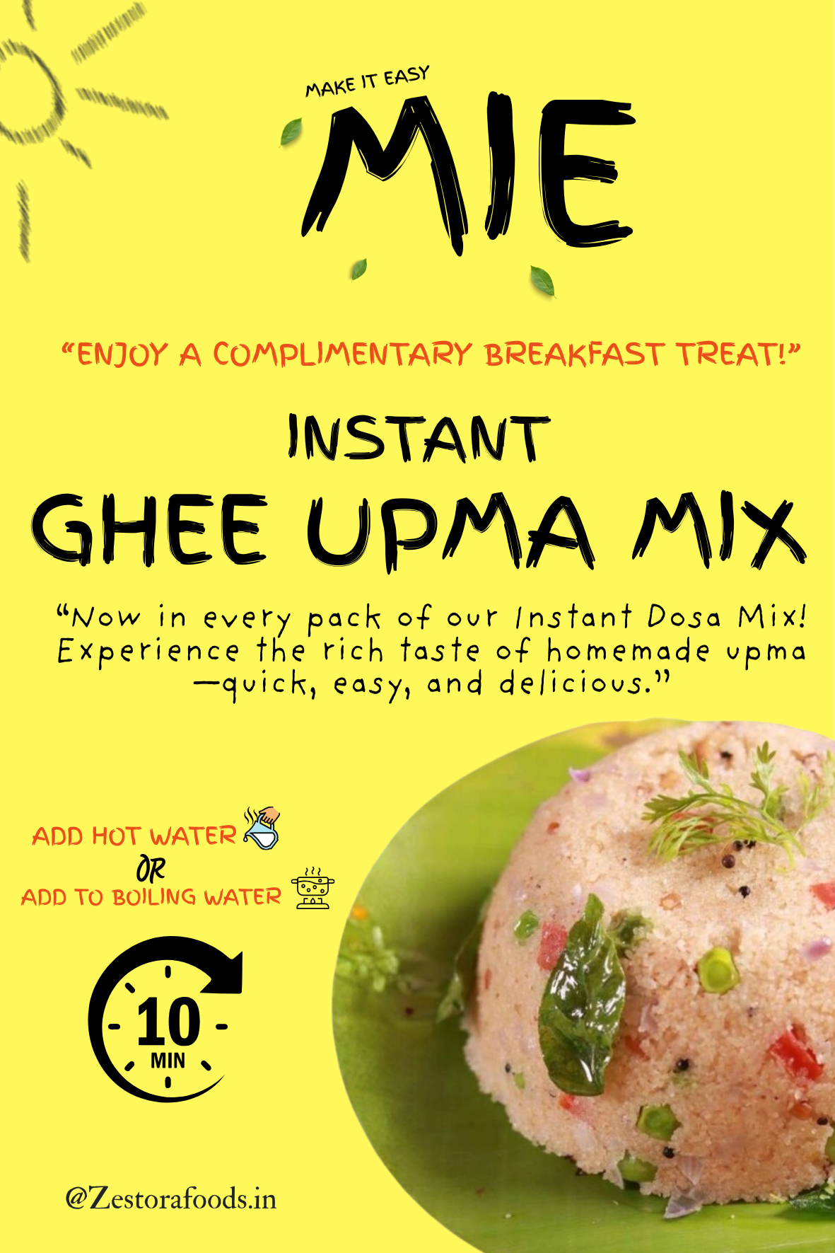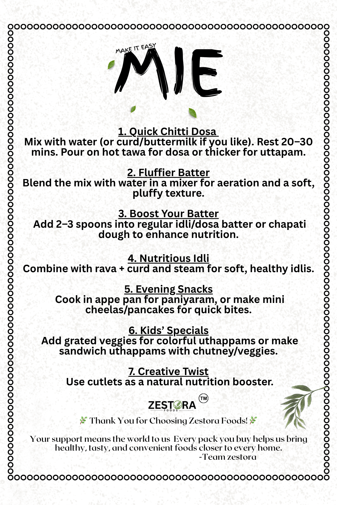 • 🥣 Mix: Take 1 cup of MIE Dosa Mix, add 1.5–2 cups of water gradually, and whisk to a smooth batter